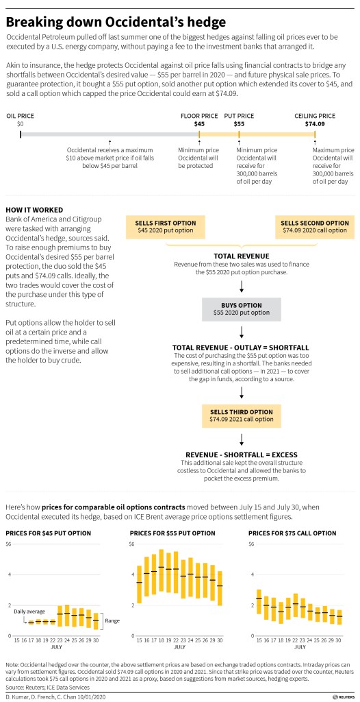 The first leg of the operation is a put option (a contract where Occidental has the right to sell at a given price) at 55 USD covering 300 thousand barrels per day of production through 2020.